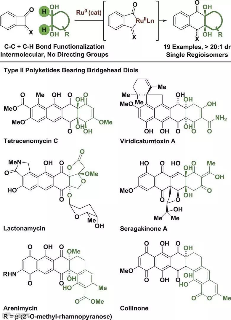 图1. Ru催化的环丁酮与邻二醇通过C-C键活化实现[4+2]环加成反应构建II型聚酮类天然产物骨架。图片来源:Science