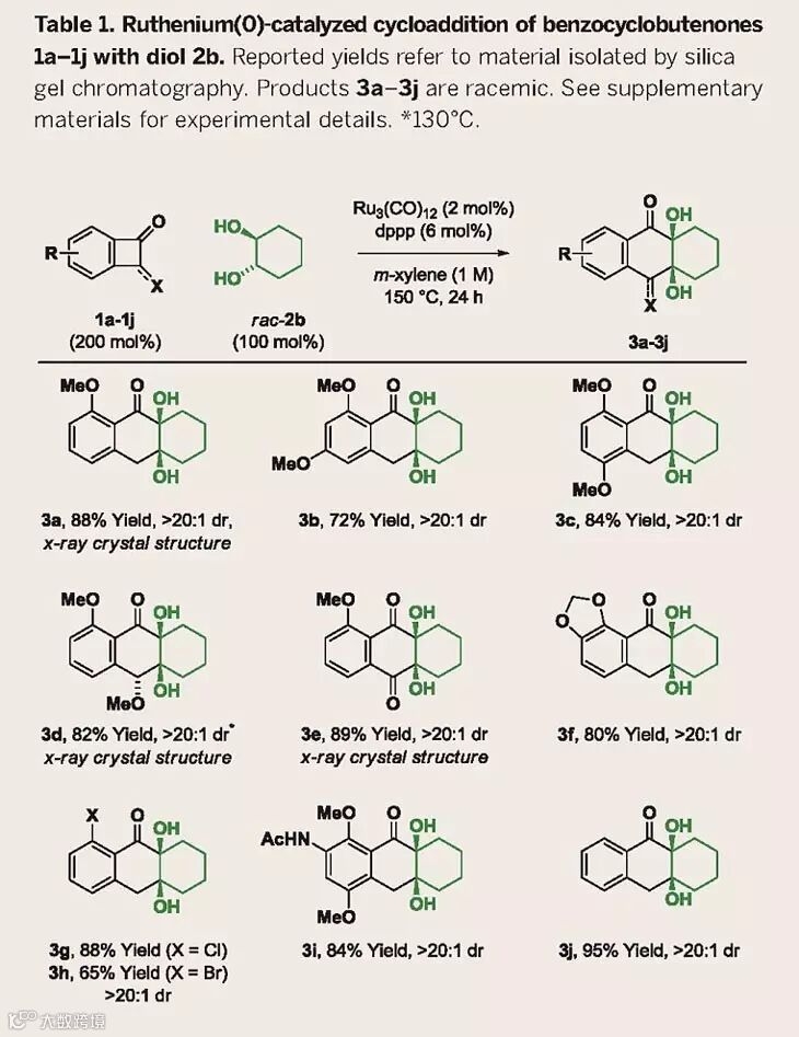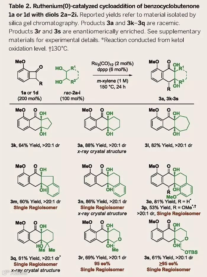 在过去的研究中,作者报道了α-羟基酯或1,2-二醇在Ru催化剂和二烯的作用下,经由脱氢生成双羰基化合物,从而实现醇α位的C-H键官能化反应(J. Am. Chem. Soc., 2012, 134, 15700-15703;J. Am. Chem. Soc., 2013, 135, 3796-3799)。作者推测C-C键活化形成的环Ru中间体也能与1,2-二醇作用,表现出类似的反应性。于是,作者从苯并环丁酮1a和外消旋的反式-环己烷-1,2-二醇出发,在Ru3(CO)12和配体dppp的作用下,于110 ℃条件下反应24 h,能以22%的分离收率和顺式非对映异构体选择性得到环加成的产物3a。当使用二甲苯作为溶剂,温度升至150 ℃时,反应的产率可以提升至88%。