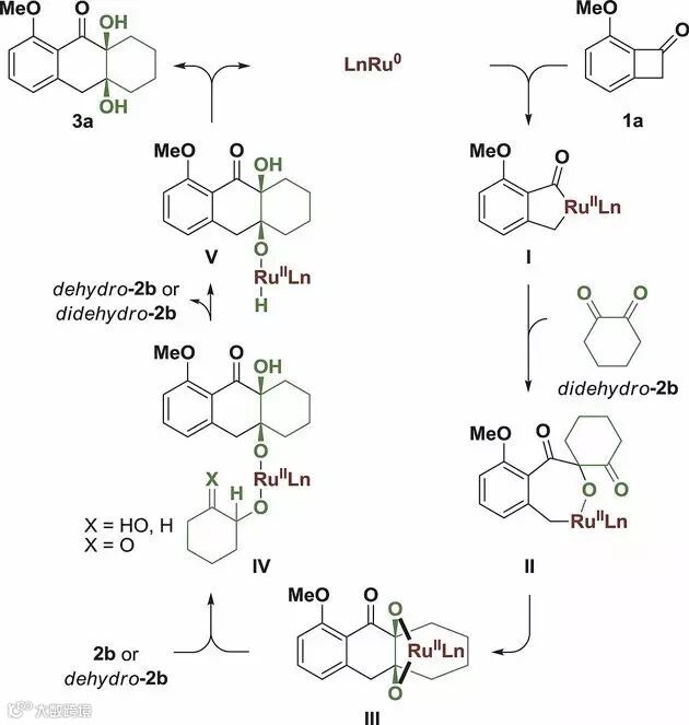 基于以往的报道,作者对该反应提出如下的机理:苯并环丁酮1a对Ru(0)氧化加成生成中间体I。随后与体系中氧化得到的环己二酮作用,经过两次羰基插入得到中间体III。III与环己醇的羟基作用生成中间体IV,进而发生β-H消除得到中间体V。V经还原消除得到最终产物,同时重新生成Ru(0)物种完成催化循环。