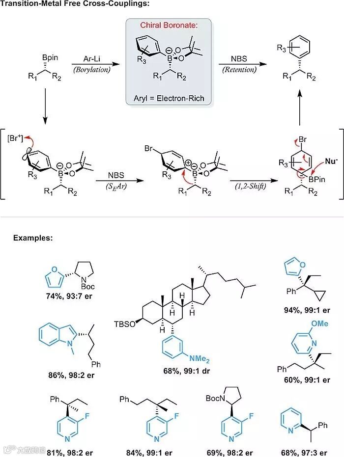 医药合成领域中,超过60%的C-C键是通过交叉偶联方式形成的。然而传统的偶联反应需要用到昂贵及有毒的金属催化剂。Aggarwal教授所开发的锂化-硼基化策略能够用于无金属交叉偶联反应,可用于富电子基团取代的芳基锂与仲或叔烷基硼酸酯的不对称交叉偶联反应,具有比较突出的优点。常见的反应机理及应用实例如图3所示。