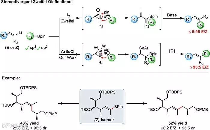 Aggarwal教授发现硼酸酯可与烯基锂发生反应,用于三取代烯烃的合成,通过产生不同的鎓盐中间体,产物与Zweifei烯烃具有相反的顺反异构选择性(图5)。