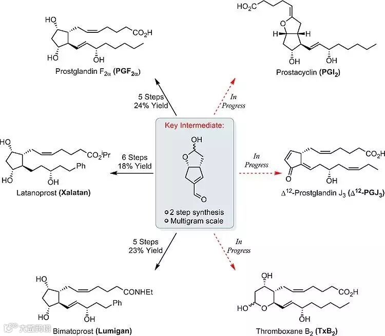 Aggarwal教授课题组所采用的策略成功合成了一种关键的烯醛中间体,从而合成出一系列前列腺素类化合物,反应步骤少、产率高、产量可至克级(图7)。其中前列腺素PGF2α的7步克级合成发表在了Nature 上(Nature, 2012, 489, 278-281)。下一步Aggarwal教授课题组将研究Prostacyclin、Δ12-Prostglandin J3、Thromboxane B2的合成。