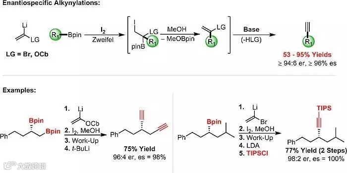 基于Zweifel烯化策略,通过采用带有离去基团的底物,Aggarwal教授课题组非常巧妙的开发了炔烃的不对称合成方法(图6)。