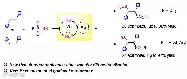可见光参与的原子转移自由基加成反应是实现烯烃双官能团化的重要手段。这类反应由于反应条件温和,具有高度的原子经济性,是当前有机化学的研究热点。传统的原子转移自由基加成反应只能实现卤素原子的转移,含硫官能团的转移尚未实现。近日,山东大学佟振合院士金属有机与光催化团队的徐政虎课题组通过金催化剂与光氧化还原催化剂的协同策略实现了包括硫三氟甲基、硫烷基、硫芳基在内的多种含硫官能团高度区域选择性和立体选择性对烯烃转移加成。