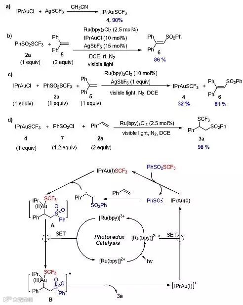 为了对反应机理进行更深入的研究,作者进行了一系列控制实验和自由基捕获实验:反应体系中加入二苯乙烯,以较高的收率得到了二苯乙烯砜产物,证明反应体系中生成了苯磺酰基自由基;他们还利用当量的金催化剂参与反应,能够分离得到IPrAuSCF3物种,该物种可以由独立合成反应确认,并且在标准反应体系中可以使用核磁共振氟谱检测到该物种;采用当量的IPrAuSCF3试剂与能提供砜自由基的前体PhSO2Cl在光催化的条件下几乎以定量的产率得到目标产物。这些实验证明了IPrAuSCF3可能是反应的中间体,结合进一步的荧光淬灭实验和瞬态吸收光谱等研究,作者推测是[IPrAu(I)]+ 淬灭了激发态的Ru(bpy)32+*,生成高活性的IPrAu(0)中间体与苯磺酰硫酯进行反应,并生成了中间体IPrAuSCF3,同时释放出PhSO2•与烯烃加成,生成的苄基自由基氧化IPrAuSCF3得到Au(II)中间体A,并进一步被Ru(bpy)33+氧化得到Au(III)中间体B,还原消除得到目标产物同时实现Au催化剂的再生。该论文发表在Chemical Science 上,第一作者是山东大学的博士生李昊昱。