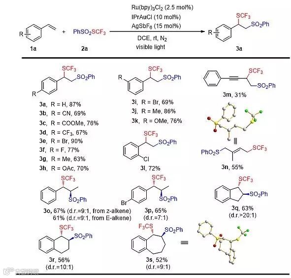 研究人员对反应的普适性进行了探索,反应不仅可以有效作用于芳基端烯,对非端烯、环状烯烃也能以较高的收率得到目标产物,且反应的非对映选择性非常好,这在传统的自由基反应中是很难做到的。研究发现顺式和反式β-甲基苯乙烯可得到相同的产物,说明两个反应可能经历了相同的苄基自由基中间体。
