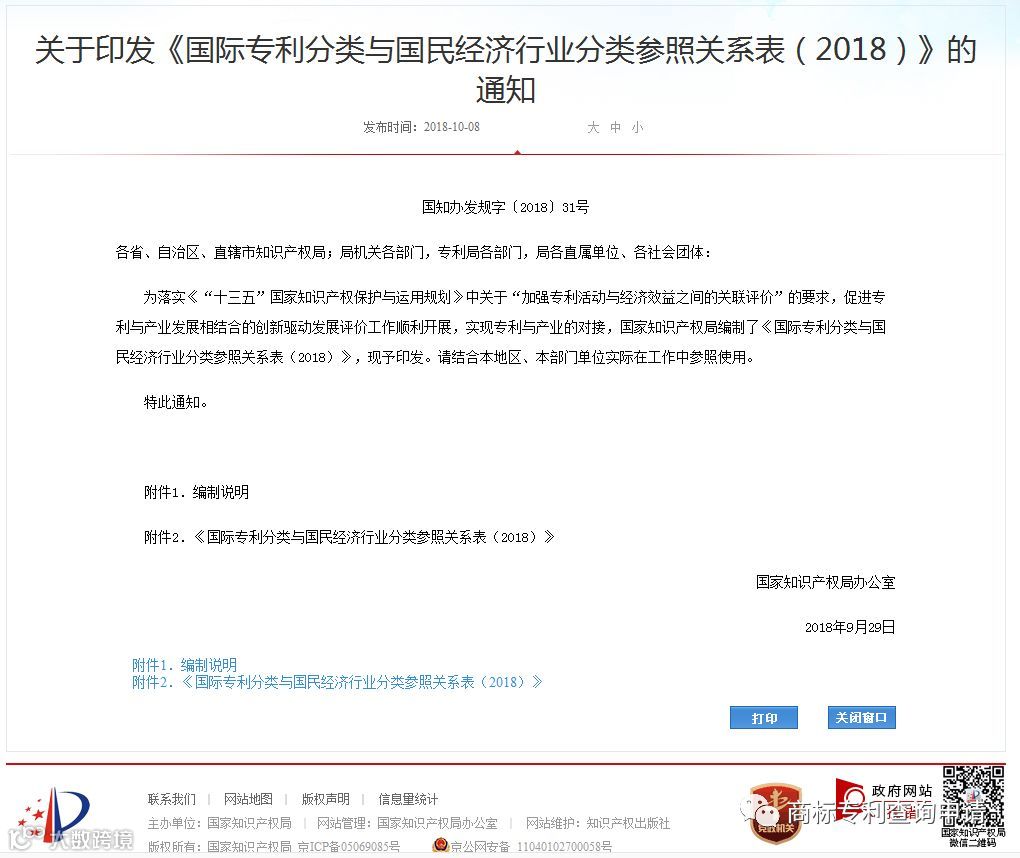 为落实《“十三五”国家知识产权保护与运用规划》中关于“加强专利活动与经济效益之间的关联评价”的要求,促进专利与产业发展相结合的创新驱动发展评价工作顺利开展,实现专利与产业的对接,国家知识产权局编制了《国际专利分类与国民经济行业分类参照关系表(2018)》,现予印发。请结合本地区、本部门单位实际在工作中参照使用。