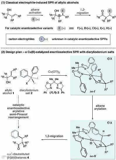Semi-Pinacol重排反应(SPRs)在复杂分子的合成中扮演越来越重要的角色。经典的SPRs首先通过离去基团的活化产生亲电碳原子,随后与氧原子相连的碳发生1,2-迁移反应。烯丙醇类底物的使用极大地扩展了SPRs的范围,涌现出许多不对称SPRs类反应,如通过卤化或环氧活化烯烃,Brønsted酸催化、钯催化和Brønsted酸/钯共催化等。然而,通过C-C键的形成来活化烯烃的例子却很少。来自英国剑桥大学的Matthew J. Gaunt教授长期以来致力于铜/手性双噁唑啉催化体系与二芳基碘鎓盐底物作用产生手性芳基亲电体的研究,手性Cu(III)-芳基中间体可与一系列亲核试剂如吲哚、烯醇硅醚等发生交叉偶联反应高效构建丰富多样的手性化合物。在以往工作的基础上,Matthew J. Gaunt教授设想可以利用烯烃芳基化的策略,烯丙醇参与对亲电体Cu(III)的双齿配位,从而发生烯烃芳基化驱动的不对称SPRs(图1)。