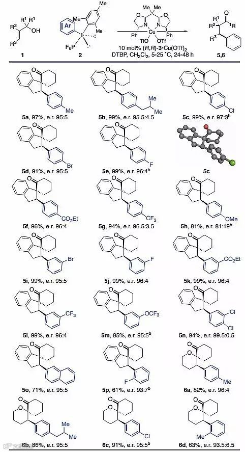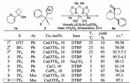 作者首先选择1a作为模板底物对条件进行筛选,考察底物二芳基碘鎓盐2的阴离子部分,从结果可以看出不同阴离子对产物4a的产率和对映选择性影响很大,六氟磷酸盐可以得到最好的催化结果,以95%的产率和92.5/7.5的对映选择性得到目标产物。作者随后对更多的反应条件如铜源、碱、芳基取代基和温度进行了考察,最佳的反应条件是:(R,R)-3•Cu(OTf)2作为催化剂,X为六氟磷酸根,Ar为Mes取代基,DTBP作为碱,于5 ℃下反应,以96%的产率和97/3的对映选择性得到目标产物4a(图2)。