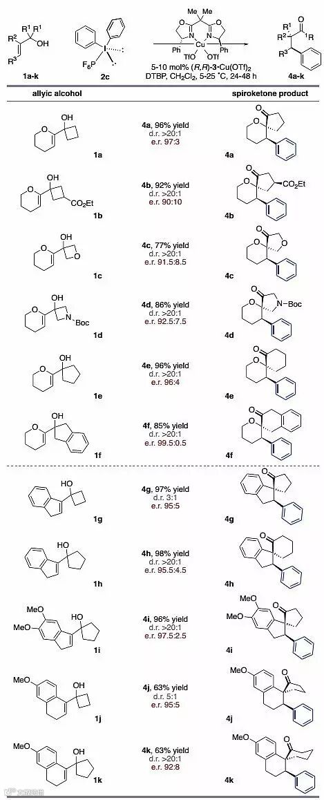 在最佳条件下,作者对底物的普适性进行了考察。首先他们固定2c,考察烯丙醇部分。对于单环烯丙醇类底物,不管是四元还是五元环状醇,环状醇内的杂原子是氮还是氧,都能以优秀的产率(77-96%)、优秀的对映选择性(90/10-99.5/0.5)和非对映选择性(>20/1)得到产物4a-4f。作者随后考察环状苯并环戊烯或环己烯类环状醇的反应结果,从图3可以看出,苯环取代基和环的大小对产物的非对映选择性影响较大,对对映选择性影响较小(图3)。