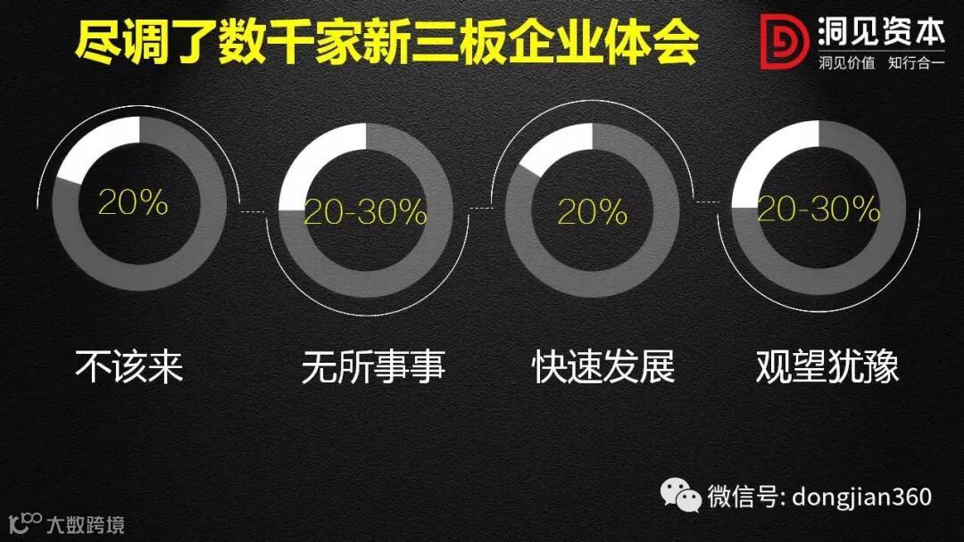 当然也有20%-30%的企业并没有理解为何挂牌新三板或者说并不适合挂牌,还没有准备好规范挂牌上市,或许退市是更好的选择,剩下的大部分新三板企业挂牌后并没有很好利用这个市场和工具,或者说不会利用。未来随着新三板市场的成熟,这些企业董事长董秘等高管团队借助更多的市场功能和工具,这个市场会帮助到更多的中小企业,也会吸引更多优质中小企业进入留在新三板市场。