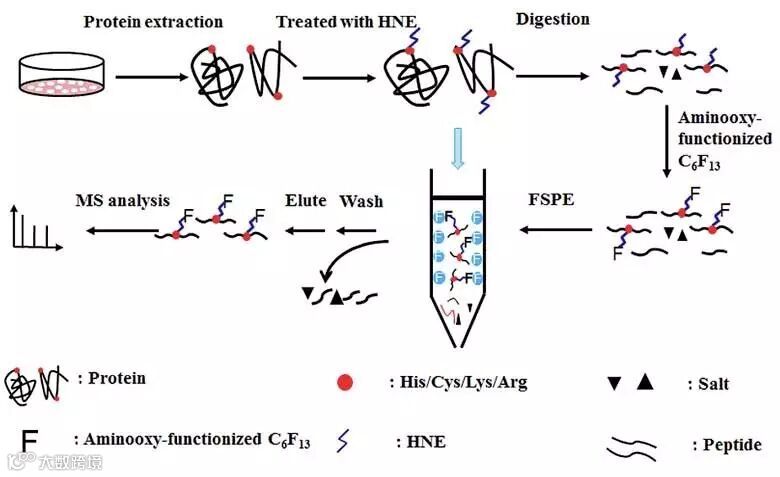 A:基于FSPE技术的“氟蛋白质组学”方法始于2005年,已成功应用到其他蛋白质翻译后修饰的研究中,例如蛋白质的硝基化修饰、磷酸化修饰等。此前的研究中,我们课题组已成功地将FSPE技术应用到人血清N-糖组的高选择性、高灵敏检测之中。由于N-糖链和HNE修饰肽段的特征官能团都是醛基,因此,我们基于研究团队以往的研究经验,产生了将FSPE技术应用到蛋白质HNE修饰组学研究中的想法。