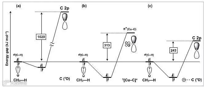 Figure 4. Energy gaps (kJ•mol-1) between the σ(C-H) orbital of methane and (a) the vacant C 2p orbital of C(1D), (b) [Cu-C]+, and (c) positive charge coupled C(1D).