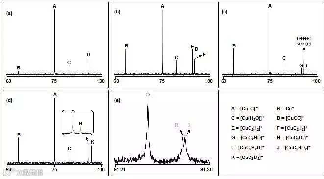 Figure 1. Mass spectra for the thermal reactions of [Cu–C]+ with a) Argon, b) CH4, c) CH2D2, and d) CD4 at a pressure of 3.0×10-9 mbar and a reaction time of 3s, respectively. e) High-resolution mass spectrum of m/z = 91. The x axes refer to m/z.