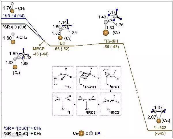 通过高级别的量子力学计算,他们阐明了[M–C]+ (M = Cu和Au)与甲烷反应的微观机理。图2给出[Cu–C]+与甲烷反应的部分势能面;[Au–C]+与甲烷的反应细节见参考文献[3]。如图2所示,分离的反应物可从单线态或三线态出发,这两个势能面在最小能量交叉点处相交,在相交过程中发生三态到单态的自旋翻转,产生1EC。随后反应以前所未有的方式进行:1[Cu–C]+的亲电碳原子通过1TS-diH同时插入到甲烷的两个C–H键中。与此同时,生成的CH2向后弯曲,而甲烷中的剩余CH2基团沿C–C键轴旋转90°,从而产生乙烯复合物1I。值得注意的是,该协同机理的过渡态(1TS-diH)在一步反应中同时断裂甲烷的两个C–H键,并形成两个新的C–H单键和C=C双键,还将一个σ(Cu–C) 键转变为新形成的与铜作用的C=C双键的π键相互作用。1TS-diH在所考虑的四个途径中仍然具有最低的能垒。需要指出的是,这是关于甲烷协同双C–H键活化的首次报道。
