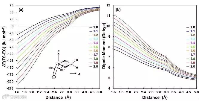 [Cu–C]+中Cu的作用通过Gedanken实验揭示。如图4c所示,近C(1D)正点电荷在降低C(1D)的2p空轨道能量方面比Cu+效果更显著。如图5a所示,随着点电荷逐渐靠近C(1D)原子,能垒逐渐降低直至消失;在保持距离恒定的同时增加点电荷的强度也具有相同的效果。当OEEF强度上升至一定大小,能垒会消失,协同机理转变为无能垒的过程。随着点电荷的场强增加,过渡态1TS-diH的偶极矩也增加(图5b)。由此可见,这种金属离子产生的影响可以通过正点电荷来模拟,其机理的切换可以通过任意调整OEEF的方向和强度来实现,由此提出“电荷诱导催化(Charge-Induced Catalysis)”的概念。