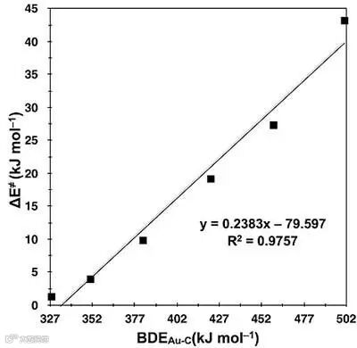 [Au–C]+、[Cu–C]+与甲烷究竟采取分步反应还是协同反应机理进行作用归因于金属碳化物[M–C]+ (M = Cu和Au)键的解离能(BDE)不同(表1)。如图3所示,理论模拟的[Au–C]+的BDE值与ΔE≠之间接近线性关系,ΔE≠随[Au-C]+的BDE值的减小而减小。因此,[M–C]+的BDE值大小是其反应机理由逐步反应转化为亲电碳原子插入甲烷两个C–H键的协同反应的根本原因。