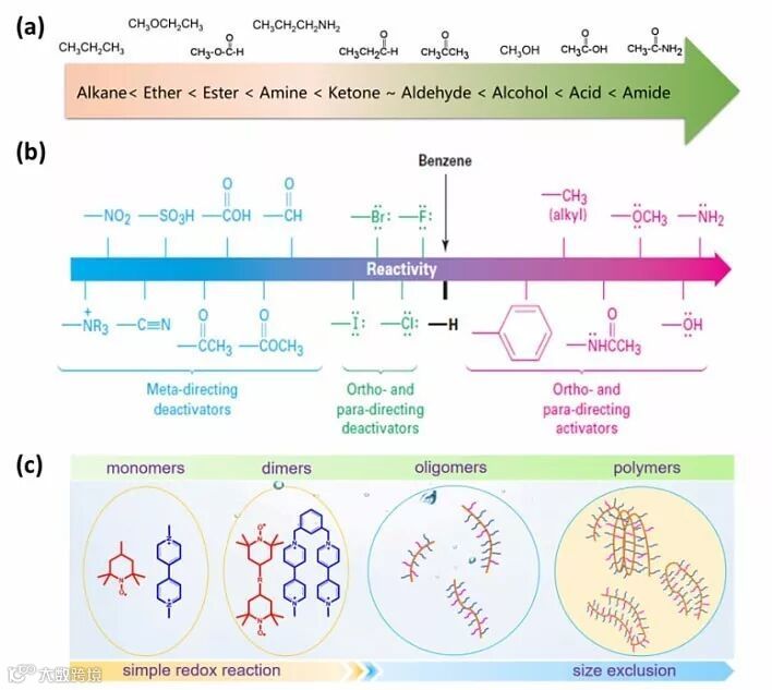 (a)常见有机基团的极性顺序;(b)常见有机基团诱导效应de 顺序;(c)有机活性分子的尺度调控。