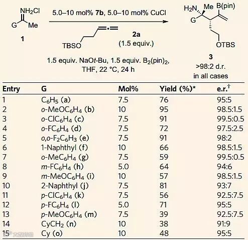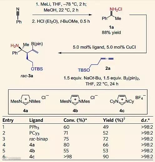 首先,作者设计了甲基锂和苯甲腈反应,进而盐酸酸化得到甲基酮亚铵盐酸盐化合物1a,在5 mol%的CuCl以及1.5当量的甲醇钠、1.5当量的B2(pin)2的存在下1a和TBS修饰的联烯2a反应。他们对配体进行了筛选,包括膦配体和氮杂环卡宾配体,最后发现使用氮杂环卡宾四氟硼酸盐4c可以得到最佳结果,产率高达90%,d.r.选择性为98:2(entry 6)。