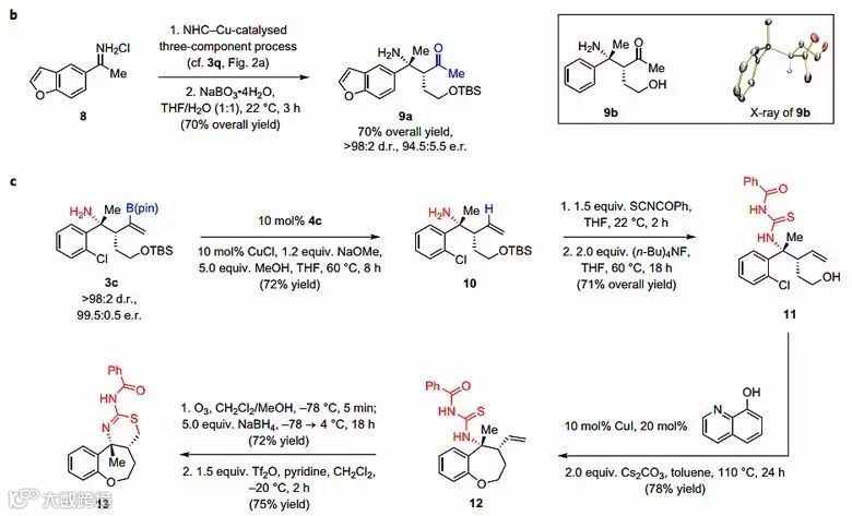 在图5的底物扩展中,底物3中的G还可以为缩醛、苯并呋喃、噻吩等结构,联烯化合物的结构和取代基也都可以作出调整,10种底物反应的产率中等,其中产物3y还通过X射线单晶衍射确定了结构和立体化学。如图5b所示,底物发生烯丙基化反应后,得到的烯基硼化合物可再发生氧化得到酮类化合物9a,具有理想的产率和选择性。9a消除TBS保护基得到化合物9b,并通过X射线单晶衍射确定了其结构和立体化学。在图5c中,3c先消除烯基硼化合物的硼酸酯基团,得到化合物10,与苯甲酰基异硫氰反应得到取代的硫脲,再消除TBS保护得到化合物11,碱性条件下分子内环化得到化合物12,对端烯臭氧化并使用硼氢化钠还原至一级醇并使用三氟甲磺酸酐保护,最终分子内环化得到三重骈环化合物13。