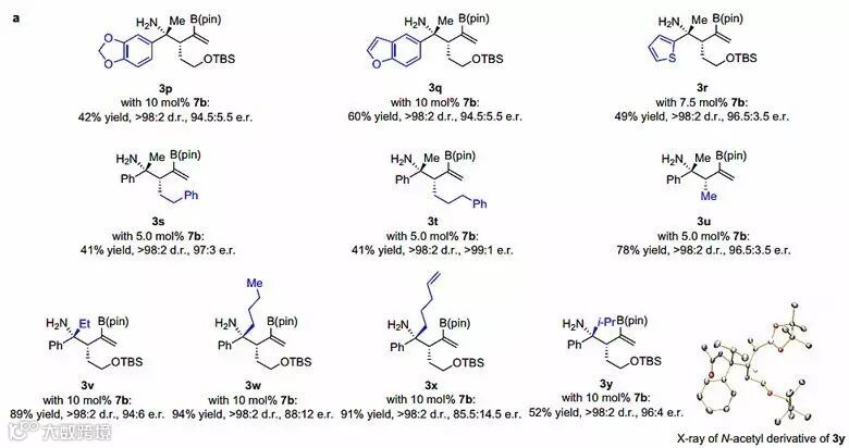 如图3所示,随后作者对手性配体进行了筛选,发现在5 mol%的手性配体7b存在的条件下,反应能以51%的产率和95:5的e.r.选择性得到手性的高烯丙基胺3a(entry 7)。