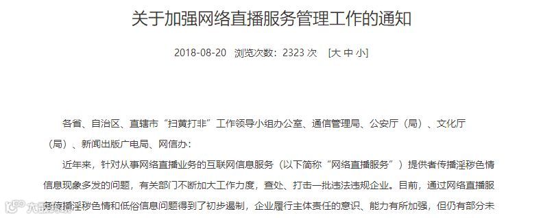 斗鱼直播发布的数据显示,斗鱼的手机、电脑注册用户各超过1亿,市场占有率为80%,位列第一。早在8月20日,全国“扫黄打非”办公室就联合工信部、公安部、文化和旅游部、国家广播电视总局、国家网信办下发了《关于加强网络直播服务管理工作的通知》,对网络直播进行全面监管,对违规直播服务进行大面积清理。