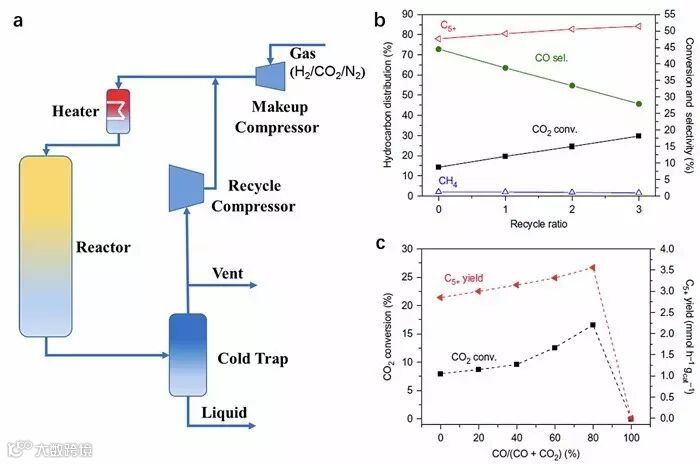 此外,在Nature Chemistry 这项工作中,作者已完成了催化剂制备放大并得到高机械强度的工业尺寸颗粒催化剂,并且进行了工业条件下的测试。如图5所示,通过对反应尾气的循环利用,CO2的转化率可以从8.7%提高到18.2%。同时,C5+ 烃类产物的收率也可以从78%提高到84%。同时,考虑到CO2加氢反应会生成CO,因此作者还研究了原料气中CO的影响。如图5c所示,添加适量的CO会促进CO2的转化,同时提高C5+ 产物的收率。作者认为,CO能够更加有效的还原In2O3,产生高反应性能的氧空位,从而促进CO2的加氢。