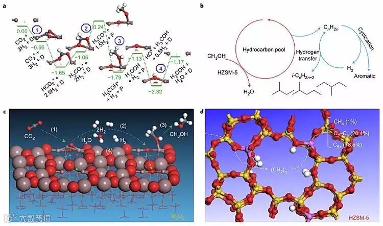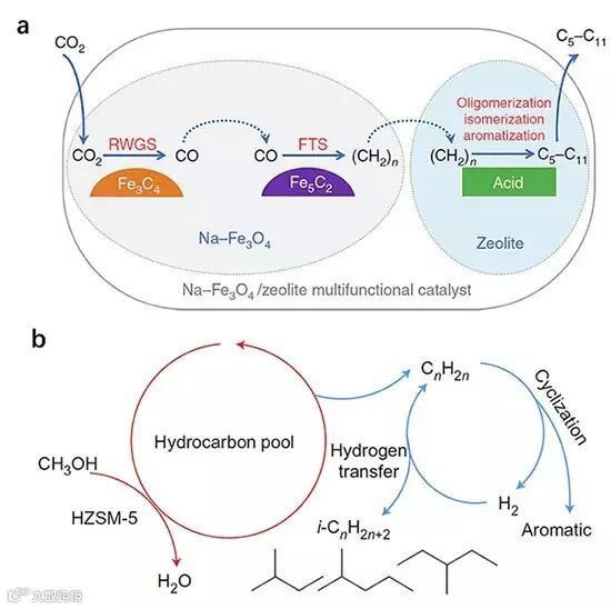 图4. CO2加氢制取烃类燃料在不同催化剂上的反应机理。(a) Na-Fe3O4/HZSM-5, (b) In2O3/HZSM-5。图片来源:Nat. Commun. / Nature Chem.