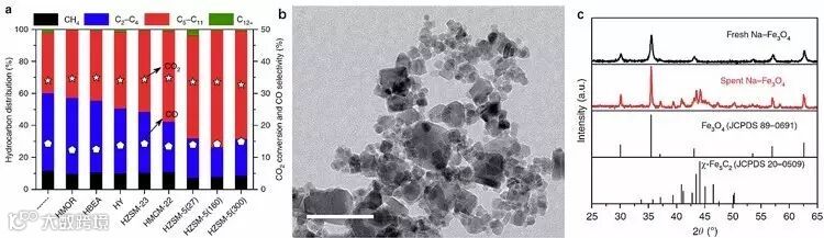 图1. (a) Na-Fe3O4和不同分子筛材料的组合在CO2加氢反应中的催化性能。(b) Na-Fe3O4纳米粒子的电镜图,标尺为100 nm。(c) 反应前和反应后的Na-Fe3O4纳米粒子的XRD图。图片来源:Nat. Commun.