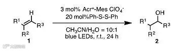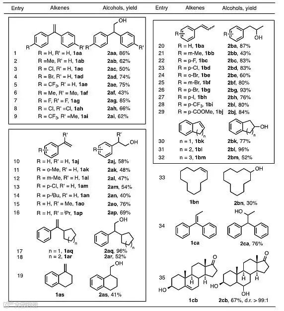 该反应以Acr+-Mes ClO4-为光催化剂,Ph-S-S-Ph为质子转移催化剂,乙腈为溶剂,在蓝光的照射下常温条件就能发生烯烃的反马氏水合反应。实验结果表明,该体系的底物适用范围广,官能团兼容性好。苯乙烯类衍生物,包括1,1-二苯基乙烯类衍生物、α-烷基苯乙烯类衍生物等都能够高效高选择性地得到相应的一级醇,β-甲基苯乙烯类化合物、环状烯烃等内烯同样能够以较高的产率和较好的官能团兼容性得到相应的二级醇类物质。值得一提的是,去氢表雄酮这一甾环化合物作为烯烃在这一光催化体系下可以得到较好的产率。