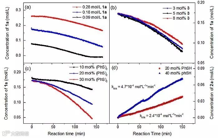 为了深入探究反应的历程,作者以1,1-二苯乙烯的水合反应作为模板反应,利用原位红外光谱实验进行了反应动力学的研究。他们发现当使用(PhS)2作为质子转移催化剂时会出现明显的诱导,但如果换作苯硫酚为共催化剂时则不会出现反应诱导期。因此,作者推测在反应的开始阶段应该发生了二硫化物转化成PhSH的过程。