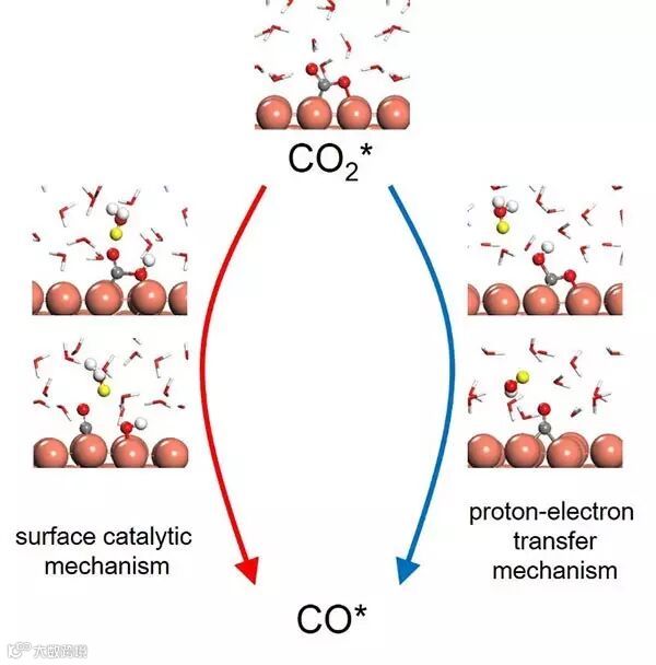 厦门大学孙世刚教授课题组长期致力电催化反应机理的基础研究。以二氧化碳的电催化还原为例,C-O键的活化有两种途径:表面途径和质子电子传递途径。表面途径和在气固界面的催化反应类似,即C-O键的活化断裂必须通过两个表面原子的路径(COOH* + * → CO* + OH*),生成吸附态的一氧化碳(CO*)和羟基(OH*)。然而在电化学界面上,在一定的电位下,可以通过质子电子传递来活化C-O键,无需第二个表面原子的参与(COOH* + H+ + e- → CO* + H2O),生成的水分子随即进入溶液。这一机理可以很好地解释为什么很多单原子催化剂也可以高效催化二氧化碳还原。该成果近期发表在Chemical Communications 上。