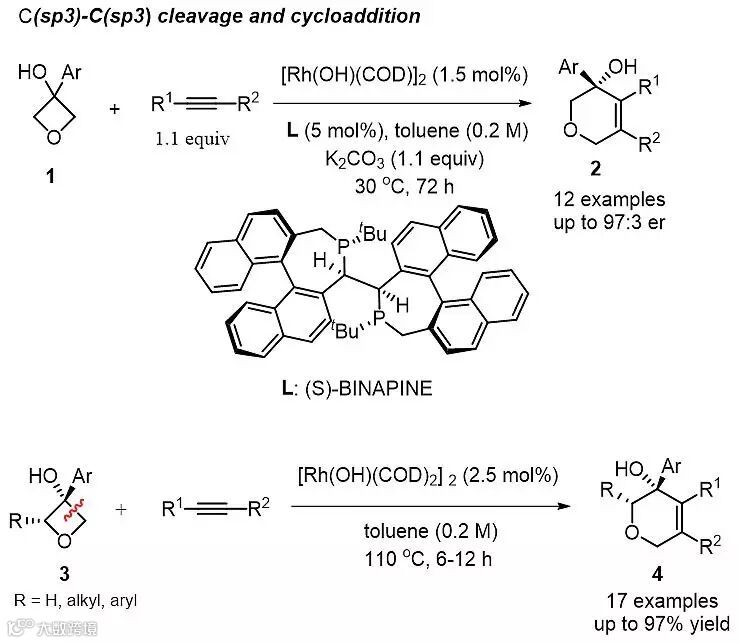 近年来,过渡金属催化的C-C键选择性断裂和官能团化反应取得了很大的进展,并且已经成功地应用于构建复杂天然产物分子的核心骨架当中。其中,环丁醇作为一类非常有用的合成片段可以参与构建很多复杂的环状分子。在以往报道的工作中,铑催化的环丁醇与不饱和2π体系进行环化时,C-C键断裂优先发生在羟基邻位的C(sp2)–C(sp3)之间,且反应大多数以非对映选择性的形式进行。如果能以高对映选择性的形式实现环丁醇羟基邻位C(sp3)–C(sp3)键断裂后再发生不饱和2π体系环化,那么对于这类方法学将是很大的拓展,同时对于传统方法学难以构建的复杂环状分子也将会有很大的帮助。