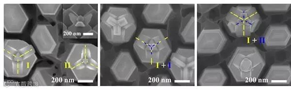 北京大学宽禁带半导体研究中心利用分子束外延在图形化衬底上生长了GaN纳米线结构。实验发现,随着生长的进行在部分六棱柱状纳米线顶端出现了正四面体形金字塔结构,具有三重旋转对称性的三个分支逐渐从正四面体的三个侧面延伸而出,这些分支构成独立的“纳米三脚架”。纳米三脚架在面内倾向于沿互成60°旋转的两个方向“I”、“II”排列。进一步延长生长时间,甚至会出现以无旋转直接堆叠(“I + I”)或互成60°旋转交叉堆叠(“I + II”)的层状纳米分支。