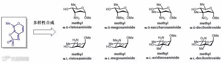 3-氨基脱氧糖是很多天然产物和药物的重要结构单元。例如,作为对抗细菌最后一道防线的万古霉素和具有抗菌活性的天然十七糖Saccharomicin A、B以及抗肿瘤药物柔红霉素、表柔比星等都含有这类糖基单元。这些稀有糖的结构对药物的活性起到重要作用,改变其结构往往会导致药理活性和理化性质发生较大变化。因而,对这些药物的氨基糖单元进行结构修饰和改造有可能发现活性更好的药物。如利用这一策略对万古霉素进行结构修饰,人们成功开发了具有更强抗菌活性的特拉万星和奥利万星两个上市药物。但是,3-氨基脱氧糖的稀有性、复杂性、多样性以及不稳定性为相关化合物的化学合成和修饰带来很大的挑战。因此,合成天然3-氨基脱氧糖及类似物、研究其糖苷化效率并探索生物学意义对氨基糖类新药的开发具有重要意义。最近,华中科技大学万谦教授和曾静副教授团队发展了一种3-氨基脱氧糖的多样性合成策略,并在此基础上对3-氨基脱氧糖的糖苷键构建进行了初步研究。