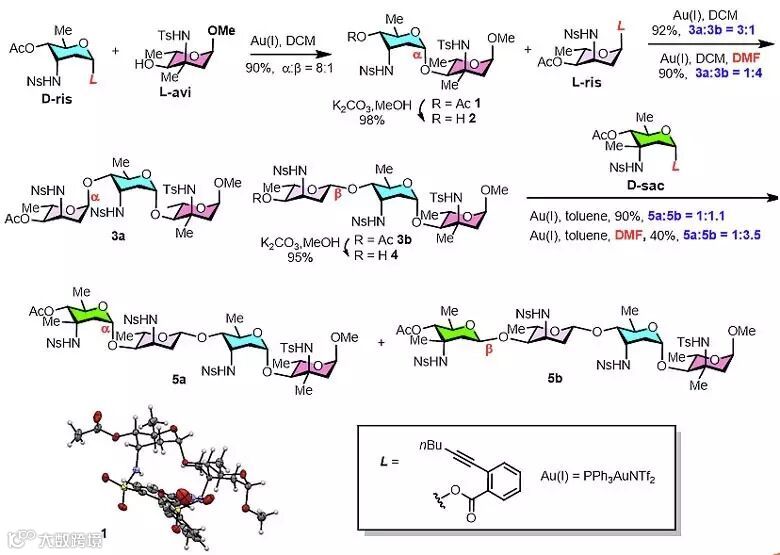 该团队通过合成具有多个反应位点的关键中间体,并对该中间体进行一系列官能化操作,成功实现了多个天然3-氨基和3-硝基糖单糖的快速高效合成。他们进一步基于温和的金催化俞糖基化方法,并通过添加调控剂DMF来调节糖基化的选择性,实现了四个3-氨基糖单糖单元的有效连接,高效构建了既含有α-糖苷键又含有β-糖苷键的3-氨基糖四糖。该工作为合成复杂的3-氨基糖类天然产物和药物奠定了基础,对开发具有抗菌、抗肿瘤活性的氨基糖类药物具有重要意义。