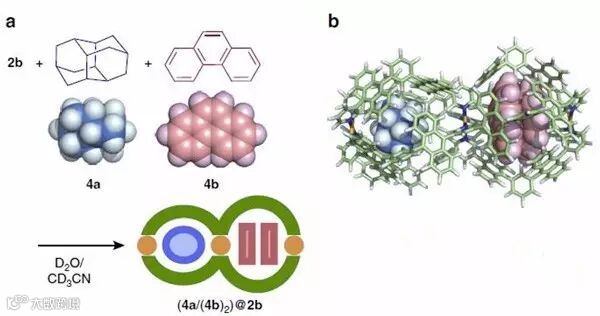 除此之外,作者还发现了这种双空腔主体可以包裹两个不同的分子,形成如下图所示的异核“分子花生”结构,4a和4b进入空腔后,导致第一个空腔的体积减少4%,同时另一个空腔的体积增大6%。