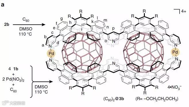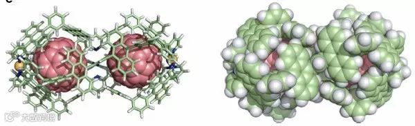“花生壳”的主体含有两个等同的空腔,可以容纳两个富勒烯C60、C70或是金属富勒烯Sc3N@C80作为“花生仁”。富勒烯进入时配体中间位置的吡啶从金属中心解离为其提供必要的空间。该过程通过双空腔结构2与富勒烯的DMSO悬浮液混合,110 ℃的加热条件下过夜搅拌即可得到“分子花生”,这种有趣的结构在室温条件下可以稳定存在数天。