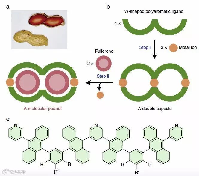 模拟自然界中物质千奇百怪的结构一直是让化学家们着迷的事情。特别是在超分子化学领域中,超分子所具有的独特空腔结构使多种物化变换成为可能。近日,日本东京工业大学的Michito Yoshizawa教授利用超分子自组装的方法合成了一种类似花生结构的分子,其成果发表在Nature Communications 上。