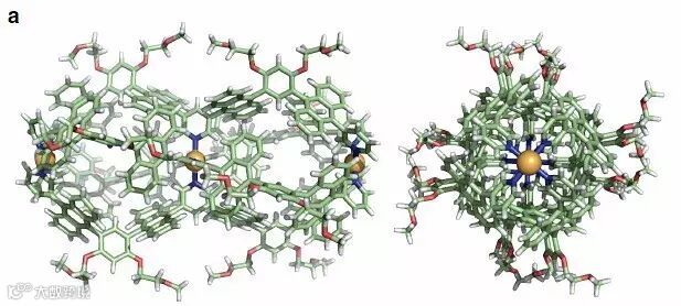 Michito Yoshizawa教授课题组通过多组分自组装的方式合成了一种花生结构的超分子,这种分子具有双空腔结构,可以容纳2个相同的富勒烯或是两个不同大小的分子。双空腔结构的长度在3 nm左右,分子量高达 8820 Da,作者还以质谱、红外光谱、核磁共振波谱以及X-射线单晶衍射等表征手段对分子的结构进行佐证,除此之外还通过理论计算加以支持。