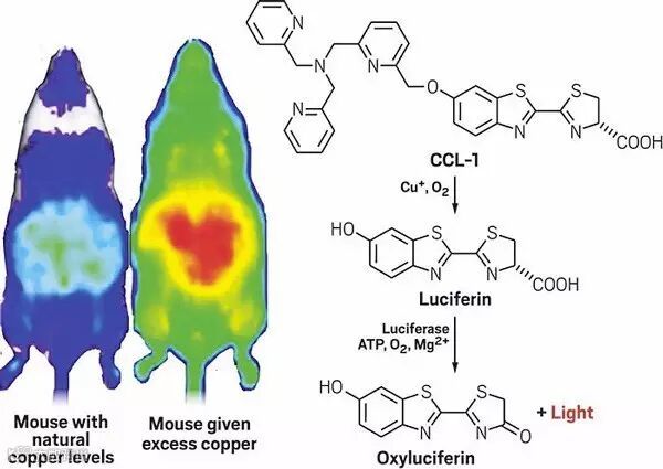 Marie Heffern的研究内容包括微量元素对生物体内激素调节的重要作用,图中展示了她在博士后研究阶段的工作。为了追踪微量元素铜在小鼠体内的作用机制,她通过基因工程使小鼠体内产生荧光素酶,并对其注射糖蛋白CCL-1。铜在小鼠体内辅助将CCL-1转化为荧光素,经荧光素酶氧化形成发光强烈的氧化荧光素。