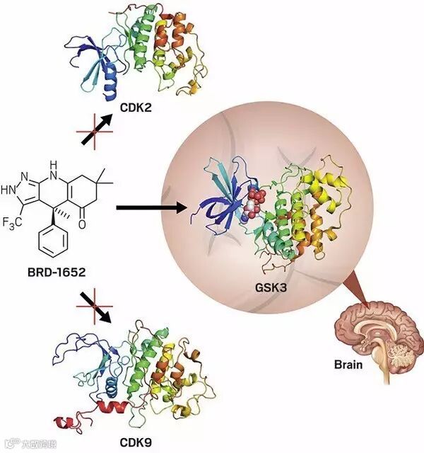 GSK3是双相精神障碍及其他精神疾病的可能作用靶标,Florence Wagner及其团队设计了一种药物分子BRD-1652,可以选择性抑制GSK3,但不与CDK2、CDK9等脑外的其他相关酶发生作用,显著降低了细胞毒性。