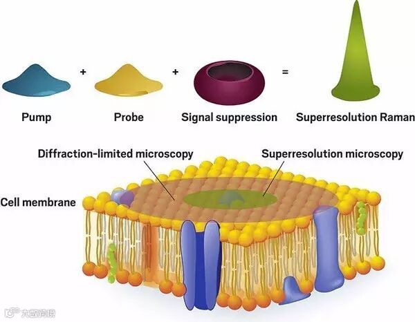 图中展示了Renee Frontiera设计的超分辨拉曼光谱显微镜的测试原理,该方法利用两组激光分别作为泵浦与探针激发拉曼光谱信号产生,并利用第三组环形激光束进行信号压制,屏蔽环中心以外的拉曼光谱信号,从而得到超分辨拉曼光谱。相比以往的衍射受限成像系统,这种新型的技术可以大大提高光谱的空间分辨率。