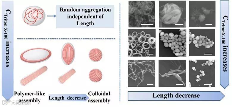 与聚合物不同的是,超细纳米线还体现出与长度直接相关的二元性(即类聚合物性质/胶体性质)。当纳米线足够长、形变熵足够大,纳米线呈现出类似聚合物的性质,这种柔韧性好的纳米线在组装过程中容易旋转、弯曲等。当纳米线长度减小,金属纳米线内部的胶体性质开始凸显,直到金纳米线在组装过程中可以看作是“硬”的构建单元。通过精确控制超细金纳米线的长度,金纳米线可以控制在“软-硬”单元之间,大大丰富了超细纳米线组装成不同形貌的复合纳米结构。厦门大学团队系统地调控了组装过程中的各种微作用力,超细纳米线可以控制在“软”和“硬”这两种构建单元之间,并获得了尺寸均一的金纳米环、金纳米谷粒和超晶格样金纳米球。