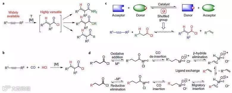 作者此前报道了以烯烃与腈为底物,通过反应过程中产生的HCN作为“穿梭分子”,实现了形式上无HCN参与的烯烃氢氰基化反应(Science, 2016, 351, 832-836,点击阅读相关)。这种“穿梭”催化反应是指一个简单的小分子在两种底物分子间进行可逆地“穿梭”,随后在特定的条件下推动反应正向进行,最终得到目标分子。他们设想这一过程可能适用于以简单的酰氯分子为酰氯供体,烯烃底物发生酰氯化的反应中,反应中无需使用CO和HCl,在合适的反应条件下,酰氯可以经历氧化加成、CO反插入、β-H消除过程形成另一分子烯烃,而烯烃底物可与催化中心配位,再经历迁移插入、CO插入与还原消除得到相应的酰氯产物,由此构成“穿梭”机制的催化体系。
