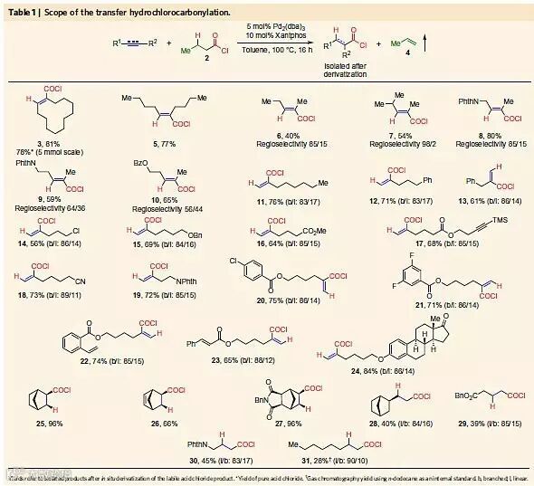 Bill Morandi教授课题组通过具有“穿梭”机制的催化体系实现了无CO/HCl参与的不饱和烃的酰氯化反应,这一途径在传统的Reppe型羰基化反应中是难以实现的。该反应使用廉价易得的丁酰氯作为CO/HCl供体,避免了使用剧毒的CO气体和腐蚀性的HCl,反应条件温和,具有良好的底物普适性,并且可以设计一锅法制备羧酸衍生物。