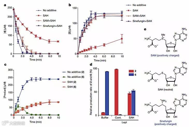 在确证LepI功能的基础上,该课题组对辅因子SAM在酶促反应中的作用机制也进行了相应探究。研究表明,SAM的结构类似物SAH和Sinefungin可以对LepI的功能进行竞争性抑制(图3),从而证实SAM所带的正电荷在LepI所催化的反应中起关键作用。