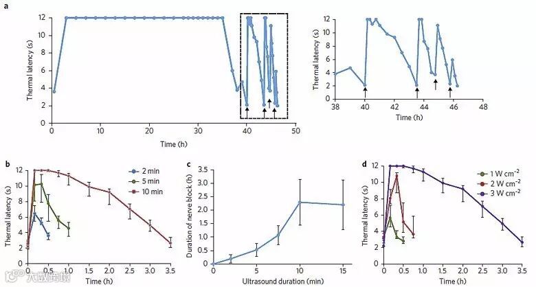 该研究成功地开发了一种超声刺激、可按需释放麻醉药物的麻醉剂,通过调控超声的强度、间隔时间及持续时间可以控制麻醉效果。利用超声刺激释放药物可谓巧妙,因为超声已经在临床上广泛使用,没有侵入性,而且组织穿透能力强。当然,这个体系也存在一些问题,如超声刺激的药物释放次数较少,对应的麻醉持续时间也较短,同时强效麻醉剂TTX的使用也可能存在潜在的安全问题。这些问题都还有待进一步研究进行验证或优化。
