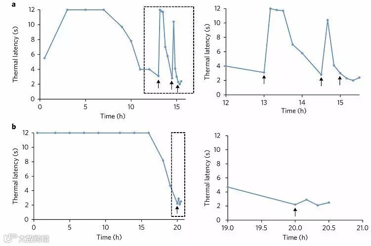 随后,作者检测了Lipo-PPIX-TTX的局部麻醉效果及可控性。他们在大鼠坐骨神经附近注射了Lipo-PPIX-TTX,并采用热板实验(将大鼠的后爪放在热板上,检测大鼠将后爪抬离热板的时间——热潜伏期,时间越长表明麻醉效果越好)检测麻醉剂的麻醉效果。他们发现注射Lipo-PPIX-TTX后的初始麻醉效果可以持续8.3 ± 4.7 h;随后进行二次超声作用(3 W·cm-2,1 MHz,10 min)产生的麻醉效果依次可持续0.7 ± 0.2 h、0.2 ± 0.2 h;第三次超声无麻醉效果(图4a)。同时无大鼠死亡,无远端麻醉效果。但是注射Lipo-TTX的大鼠有一半在注射后3-10 h内死亡,幸存下来的6只中有4只出现了远端麻醉的迹象,而超声作用不会产生麻醉效果(图4b)。这表明PPIX对于超声刺激脂质体药物释放是必不可少的。