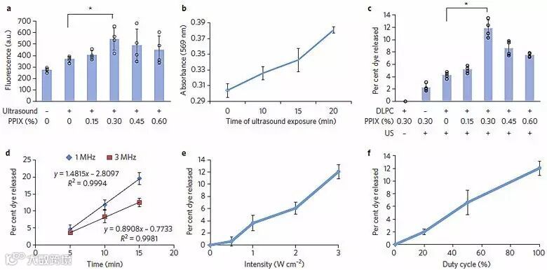 作者首先验证了超声作用下包载PPIX的脂质体是否可以产生ROS。他们选择carboxy-H2DCFDA作为ROS指示剂进行了检测,结果发现PPIX负载量为0.3%时产生的ROS最多(图2a),同时脂质过氧化程度也与ROS产生量相关(图3b)。作者选择了荧光染料磺酰罗丹明B(SRho)研究了超声对脂质体中药物释放的影响,结果发现SRho的释放与超声的频率(图2d)、持续时间(图2d)、强度(图2e)及循环周期(图2f)有关,而不含有DLPC的脂质体在超声作用下释放染料的速率明显降低(图2c)。